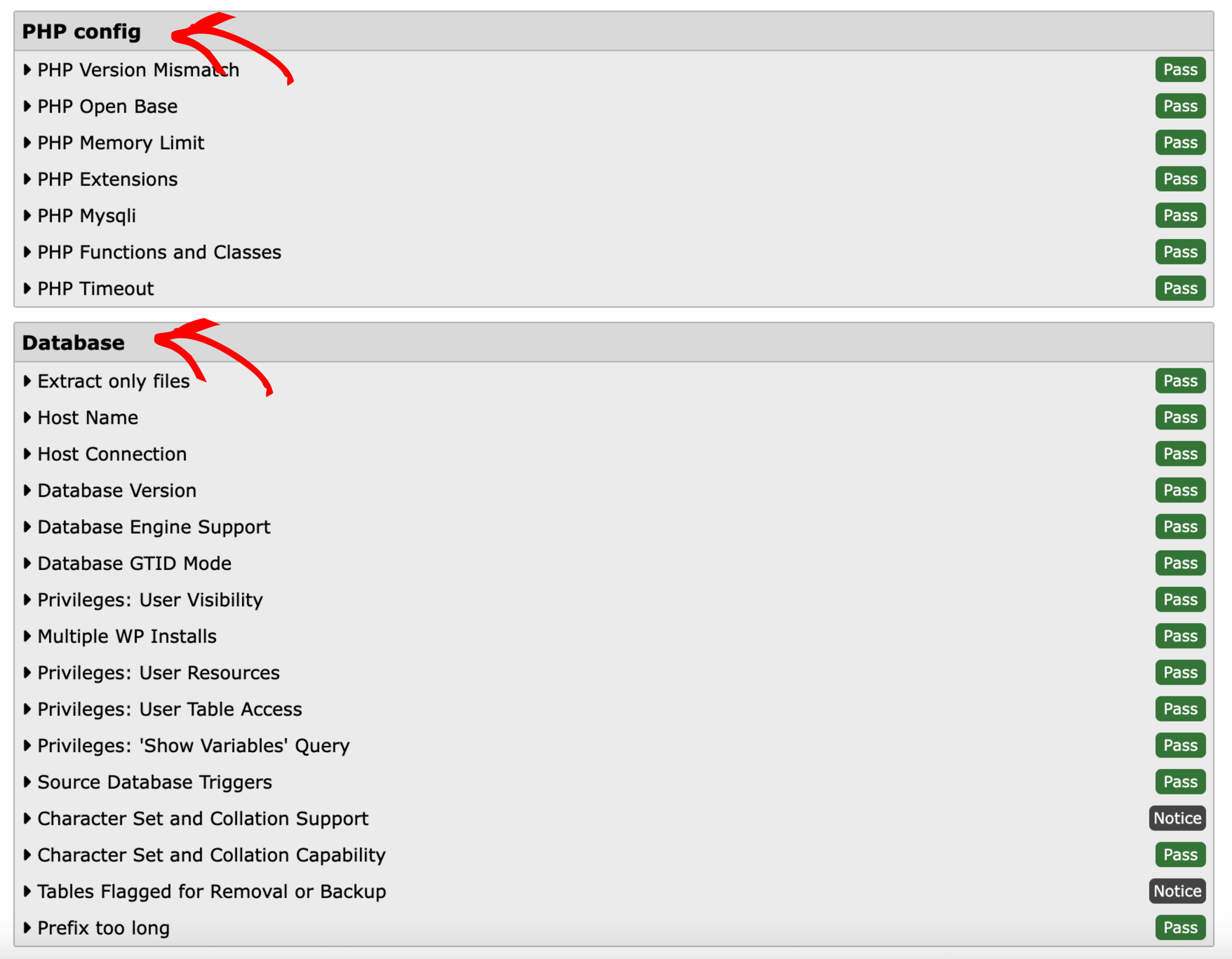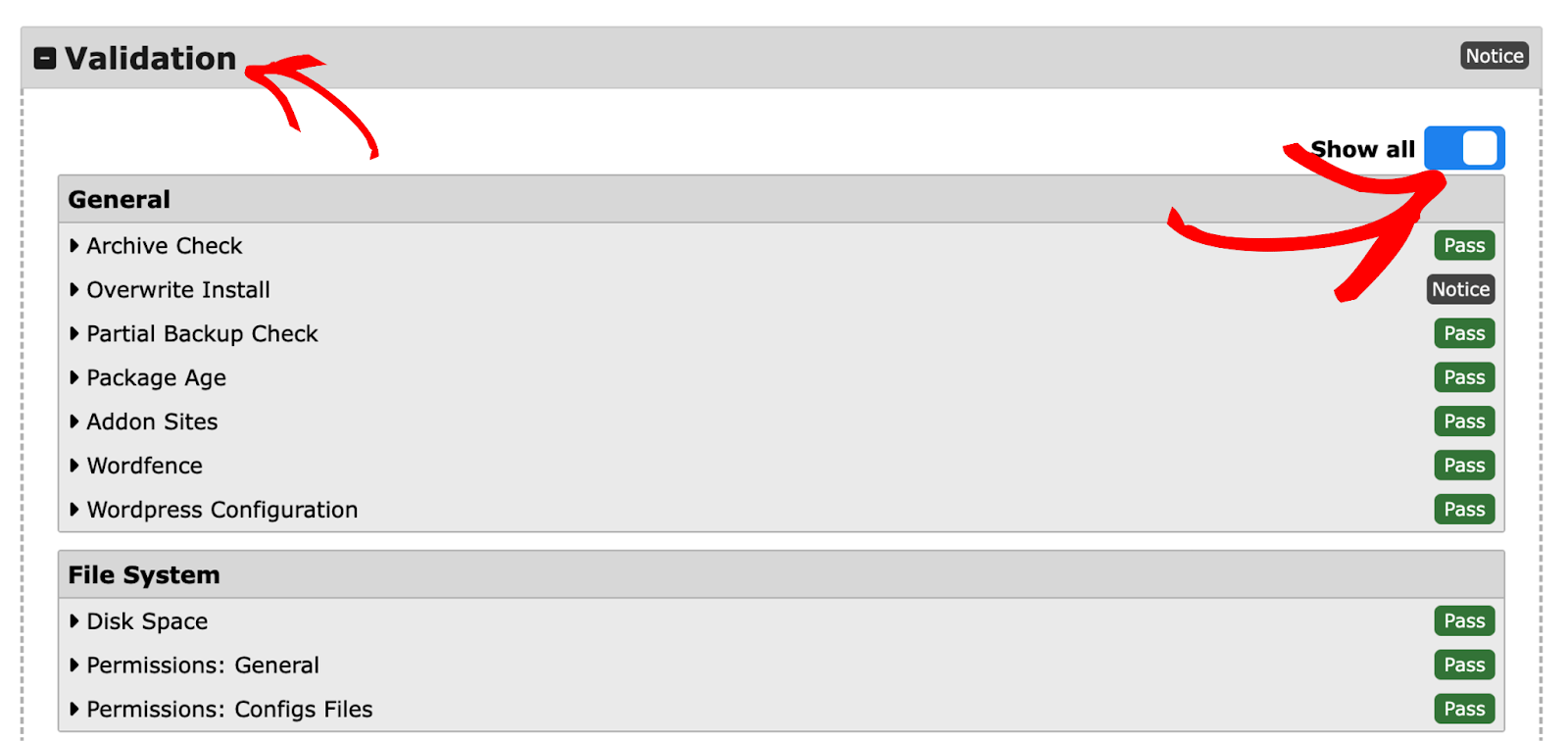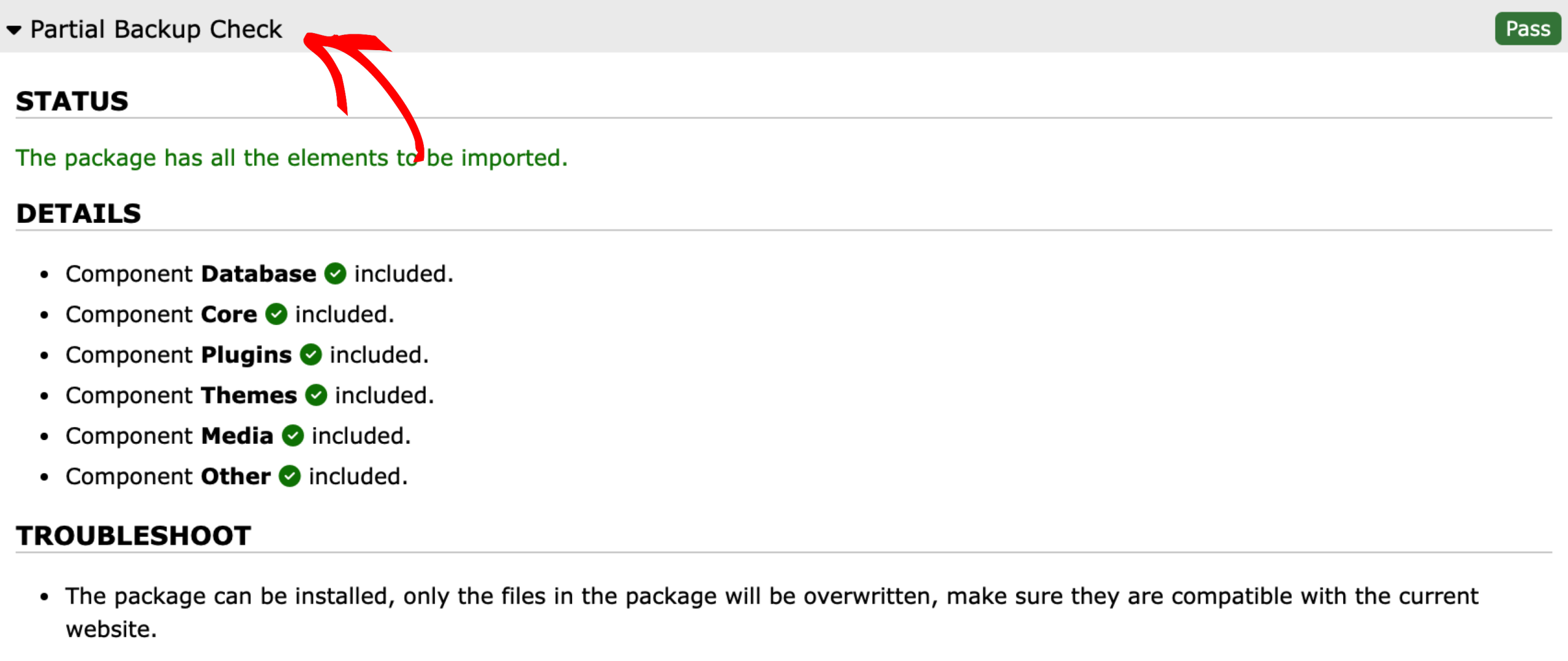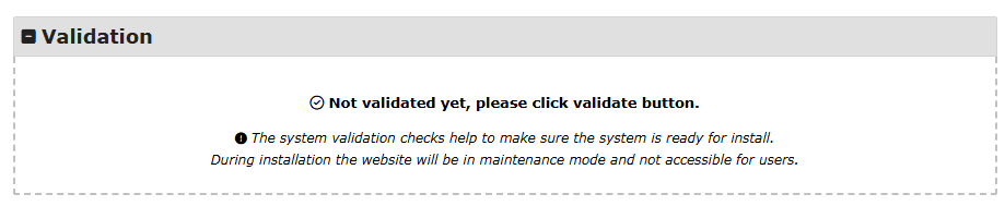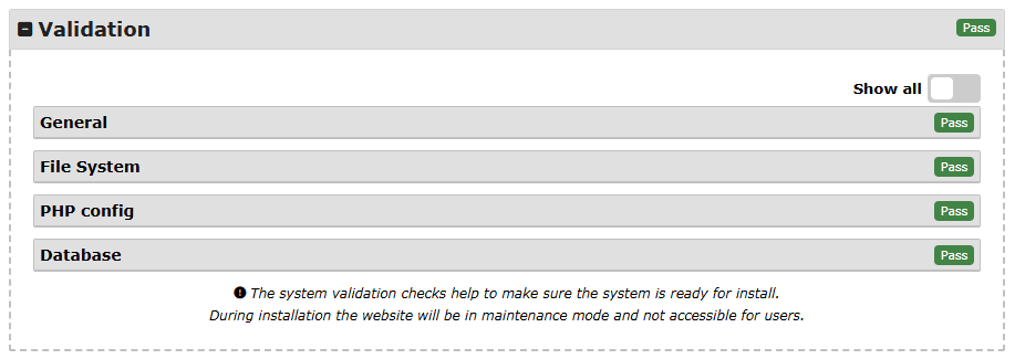 This section will give you an overview of any issues which have been detected during the installation. If no issues will be detected, a green “good” badge will be displayed, otherwise you will see either a warning or fail message.