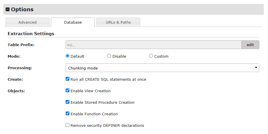 Includes only database tables from the archive. Filters enabled during the archive build process determine which tables are included. Used when an existing WordPress site is detected.