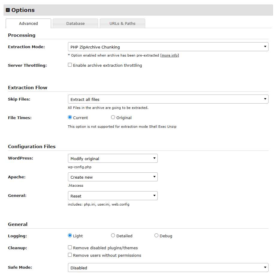 Includes both files and tables from the archive. Filters enabled during the archive build process determine which files and tables are included. Used when an existing WordPress site is detected.