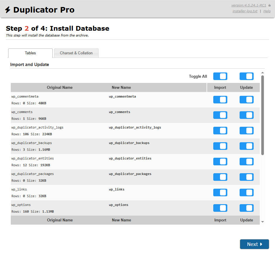 A report about the database tables, rows cells that Duplicator Pro created, scanned, and updated during the backup installation.