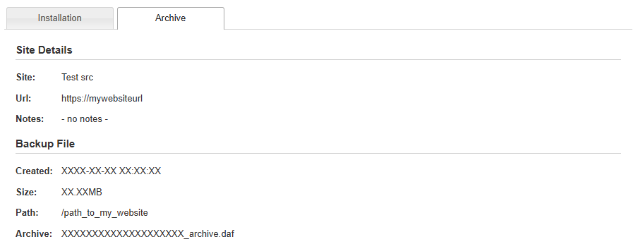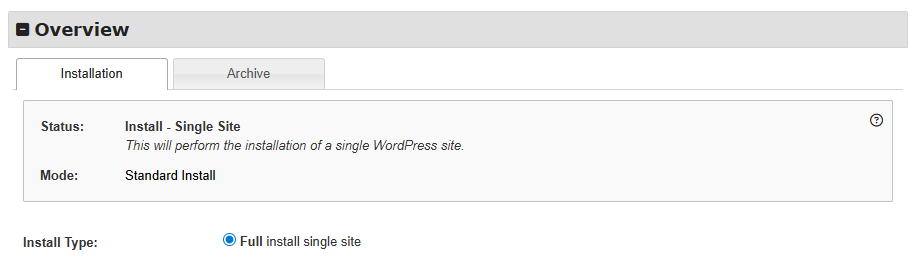 The overview section allows users to identify the status, mode and select from the install type based on the user’s install status. Additionally, there are other details about the archive file. Below is an overview of the various status, mode, and install types.