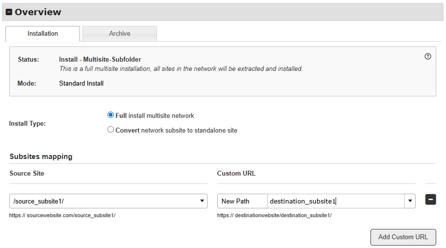 • Click the button Add Custom URL for each subsite that you will install, choose a source site, choose a New Path or a New URL for the field Custom URL, and fill it with the preferred value.