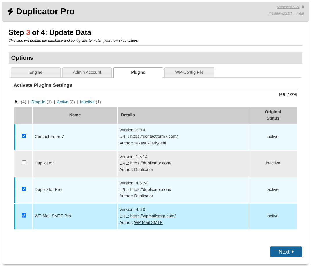 This section controls all plugins registered with the site and listed in the Plugin list table. All plugins are grouped as Active or Inactive plugins. Check all plugins that need to remain active, and uncheck all plugins which should not be active. If running the installer in “Safe Mode” then all plugins except needed ones will be disabled.