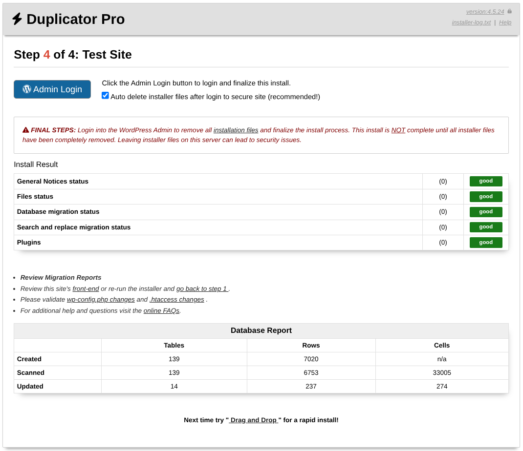 FINAL STEPS: Login into the WordPress Admin to remove all installation files and finalize the installation process. This installation is NOT complete until all installer files have been completely removed. Leaving installer files on this server can lead to security issues.