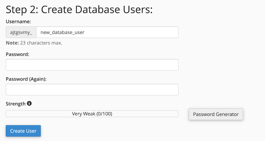 Quando terminar, a sua nova base de dados aparecerá na lista «Bases de dados MySQL », com o novo utilizador listado abaixo dela, na secção «Utilizadores nesta base de dados».